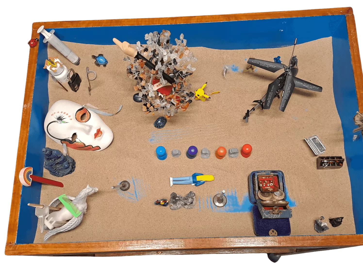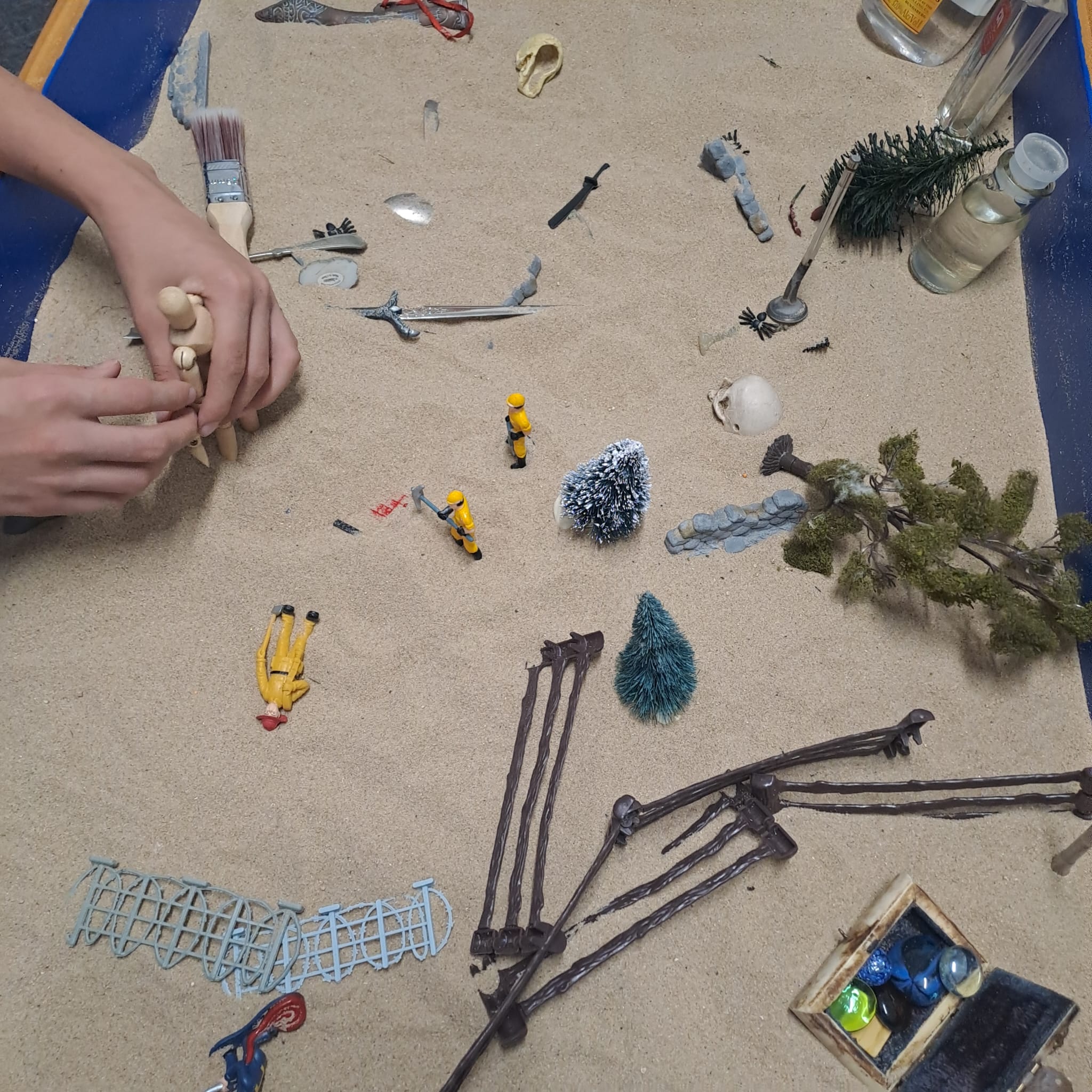 Clients select and arrange miniatures in the sand to create scenes that represent their emotions,